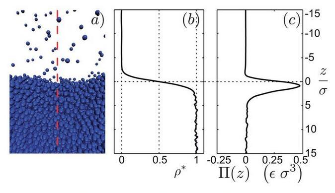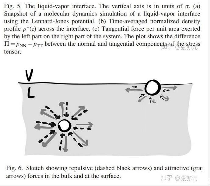 當(dāng)分子間距較小時,斥力為主,分子間距較大時,引力為主。在斥力與引力平衡時,Lennard-Jones勢能最小。現(xiàn)在,我們就可以來詳細(xì)地考慮液-氣界面了。圖5a是通過分子動力學(xué)仿真得出的液-氣界面照片,對應(yīng)的時間平均密度分布圖是圖5b。從高密度的液體到低密度的氣體發(fā)生在一個幾個分子厚度的窄區(qū)域。為了確定毛細(xì)力,我們沿垂直界面方向?qū)⑾到y(tǒng)分為兩個子系統(tǒng)(圖5a)??紤]左邊子系統(tǒng)對右邊子系統(tǒng)的單位面積的作用力,即應(yīng)力,在豎直方向上的分布。這個力有兩個來源:壓力P和額外壓力Π(圖5c)。圖5c表明有個力局部存在于界面附近,其實(shí)這個力就是表面張力,且這個力范圍和密度突變的范圍很相似。這說明表面張力的確是一個真實(shí)的力,而不僅僅是表面能的一種純數(shù)學(xué)描述。既然我們發(fā)現(xiàn)在界面附近的確局部存在一個平行的力,那我們回到問題1,為什么表面張力平行于界面而不是垂直于界面?我們注意到圖1僅僅描繪了分子間引力作用。更全面的圖應(yīng)該如圖6所示,包含了引力與斥力作用。在遠(yuǎn)離界面的液體本體內(nèi),由于液體分子周圍的完全對稱性,分子的受力完全平衡。但是,靠近界面附近的地方,上下對稱性被打破。為修復(fù)豎直方向的力平衡,向上的斥力需平衡向下的引力。而在平行于界面的方向,對稱性仍然存在,平行于界面方向的力平衡仍然存在。這就可以存在一種情況,引力作用的強(qiáng)度與斥力作用的強(qiáng)度不同。實(shí)際上,在界面附近的水平方向上,引力作用比斥力更強(qiáng),這產(chǎn)生了表面張力。