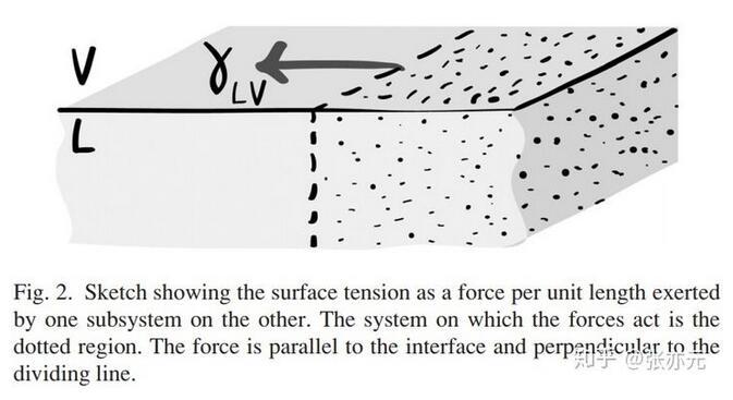 熱動力學(xué)觀點(diǎn)和力學(xué)觀點(diǎn)可以用虛功原理聯(lián)系起來。圖1中的界面處的分子明顯受到一個垂直于界面方向的力,但圖2中的力明顯平行于界面,那么第1個關(guān)鍵問題就是:為什么表面張力是一個平行于界面的力,即使它似乎一定垂直于界面?