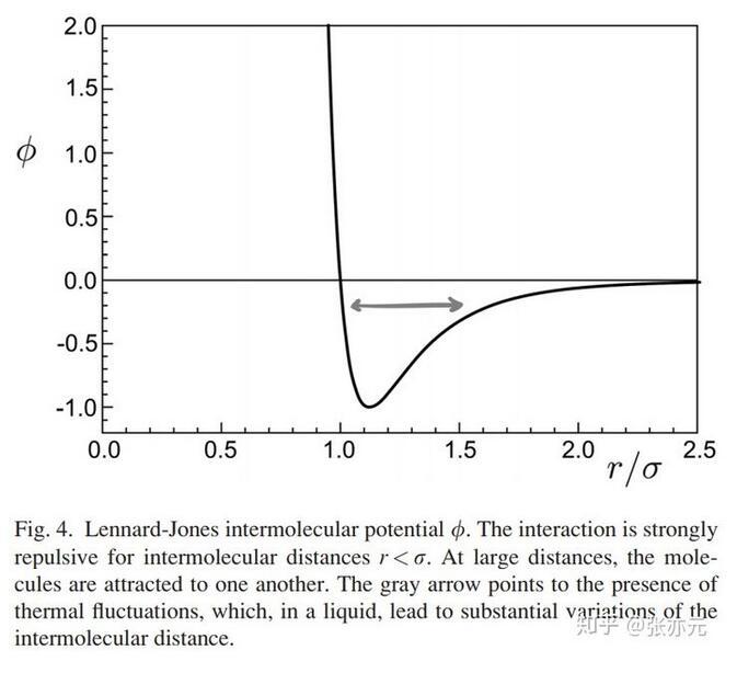 為了從源頭上理解毛細(xì)現(xiàn)象和表面張力,我們首先要考慮的就是液體分子間的作用力。事實(shí)上,一對液體分子間的作用力要么是引力,要么是斥力,與兩分子間距離相關(guān),一般可用Lennard-Jones勢能表示(圖4)。