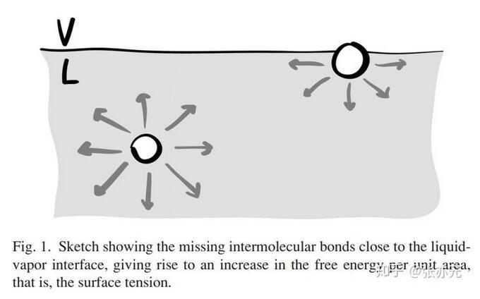 借鑒Gibbs的開創(chuàng)性工作,我們可以將表面張力理解成因兩本體相間界面存在導(dǎo)致的額外表面能。液-氣界面附近的液體分子所處的環(huán)境與本體中的分子不同,這種差異經(jīng)常被人用圖1的示意圖表現(xiàn),即近乎一半的分子間引力缺失,這導(dǎo)致自由能的增加,這是熱動力學(xué)的觀點(diǎn)。