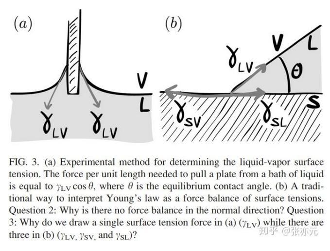 測量液-氣表面張力的標(biāo)準(zhǔn)方法是測量將金屬板拉出水面的力,這個力與表面張力γLV相關(guān)(圖3a)。而對楊氏方程(圖3b),一般認(rèn)為在接觸線處存在三個界面張力在固-液界面方向的力平衡γSL+γLVcosθ=γSV。初學(xué)者在此處會有以下困惑: