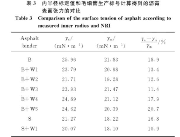 表3內(nèi)半徑標(biāo)定值和毛細(xì)管生產(chǎn)標(biāo)號(hào)計(jì)算得到的瀝青表面張力的對(duì)比