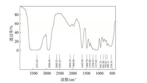 TPHS表面活性劑的紅外光譜譜圖如圖2所示。其中,3351 cm-1處為分子間氫鍵、羥基O—H的伸縮振動峰;1356 cm-1處為羥基O—H的面內(nèi)彎曲振動峰;2880 cm-1處為甲基C—H的伸縮振動峰;1230和1117 cm-1處為磺酸鹽S=O鍵的不對稱伸縮振動峰;696、762和841 cm-1處分別為苯環(huán)芳烴鄰位、間位、對位的C—H鍵的面外彎曲振動峰;1460 cm-1處為苯環(huán)骨架C—C伸縮振動峰;1960和2094 cm-1處為苯環(huán)上C—H的伸縮振動吸收弱的倍頻譜,538 cm-1處為取代苯環(huán)的面外彎曲振動峰,證明所合成的表面活性劑為目標(biāo)產(chǎn)物。