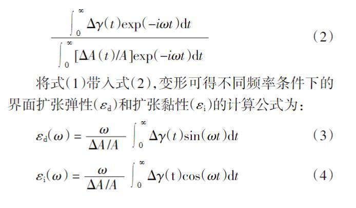對(duì)于一個(gè)幅度為ΔA的瞬間界面形變過(guò)程,在形變停止后,在一定頻率(ω)下擴(kuò)張頻率模量(ε)的數(shù)值可以通過(guò)對(duì)界面張力衰減曲線的Fourier變換得到,如式(2)所示: