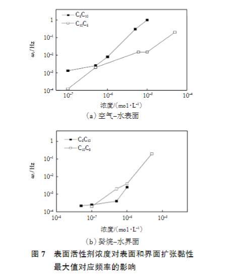圖7表面活性劑濃度對(duì)表面和界面擴(kuò)張黏性最大值對(duì)應(yīng)頻率的影響