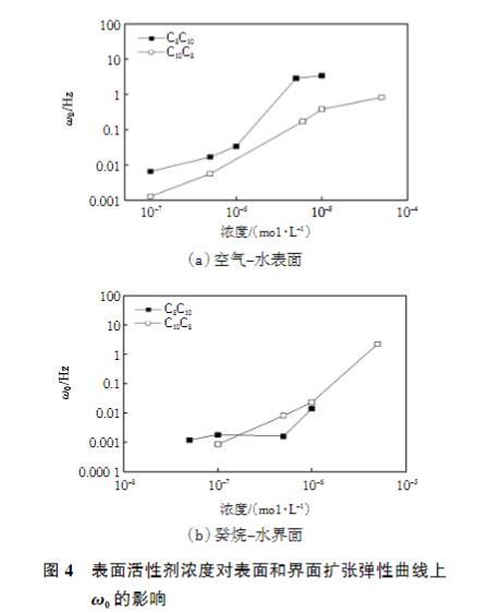 圖4表面活性劑濃度對(duì)表面和界面擴(kuò)張彈性曲線上ω0的影響
