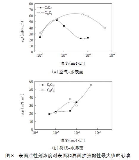 圖8表面活性劑濃度對(duì)表面和界面擴(kuò)張黏性最大值的影響