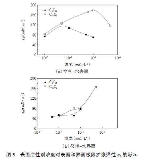 圖5表面活性劑濃度對(duì)表面和界面極限擴(kuò)張彈性ε0的影響