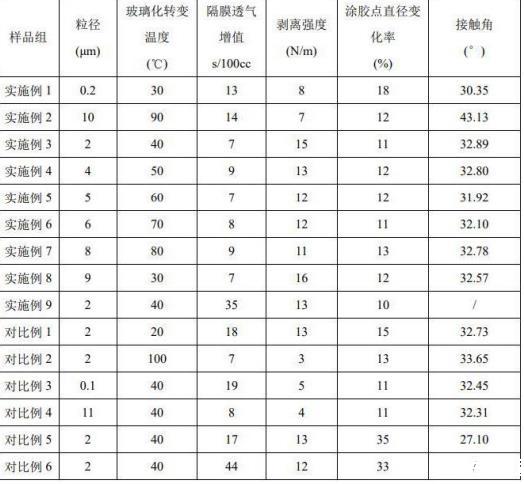 測試結(jié)果表明,當(dāng)膠液稀釋液表面張力在28mN/m以上時(shí),隔膜粘接劑組合物涂布并干燥后的膠點(diǎn)直徑變化率較小,當(dāng)表面張力太低時(shí),膠點(diǎn)直徑變化率較大,透氣增值變大。當(dāng)聚合物顆粒A粒徑在0.2-10μm,玻璃化轉(zhuǎn)變溫度在30-90℃范圍內(nèi)時(shí),隔膜同時(shí)具有較低的透氣增值以及更好的剝離強(qiáng)度。聚合物顆粒A粒徑太小時(shí),容易堵塞隔膜孔道造成透氣增值增大,并且剝離強(qiáng)度也較弱。聚合物顆粒A粒徑太大,聚合物顆粒A涂布后容易脫落,剝離強(qiáng)度降低。聚合物顆粒A玻璃化溫度太高,熱壓時(shí)無法軟化,剝離強(qiáng)度低;而玻璃化溫度太低則容易成膜,造成隔膜透氣增值變大。