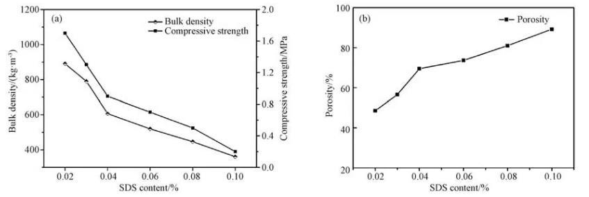圖1為固含量60%、SDS摻量分別為0.02%、0.04%、0.06%、0.08%、0.1%下所制備的多孔陶瓷坯體,經(jīng)過(guò)1190℃、保溫2 h燒結(jié)后的樣品性能。從圖中可以看出,多孔陶瓷樣品的體積密度和抗壓強(qiáng)度隨發(fā)泡劑摻量的增加而減小。當(dāng)SDS的摻入量由0.02%提高至0.1%時(shí),樣品的密度由890.53降至361.0 kg/m3,抗壓強(qiáng)度由1.7下降至0.2 MPa。當(dāng)SDS溶于水并經(jīng)過(guò)高速攪拌后,SDS分子可以吸附到氣液界面上降低表面張力并產(chǎn)生大量的氣泡,這些氣泡會(huì)緊密堆積在一起,氣泡之間有液膜將其隔開(kāi),將氣泡引入到陶瓷漿料中后,陶瓷原料分散在氣泡液膜間,形成骨架支撐,干燥后陶瓷原料液相消失,固化形成含孔隙的多孔陶瓷坯體,引入的氣泡越多,多孔陶瓷的孔隙率越高,孔壁越薄,陶瓷骨架越細(xì);當(dāng)氣泡的引入量過(guò)多時(shí),骨架易發(fā)生斷裂,此時(shí)多孔陶瓷的抗壓強(qiáng)度就會(huì)降低。