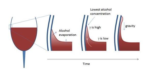 因此,這會在彎月面和葡萄酒與空氣間的平坦接觸表面之間形成濃度差,隨后將造成表面張力梯度(表面張力上大,下?。S著時間推移,使彎月面沿著玻璃杯壁向上移動。