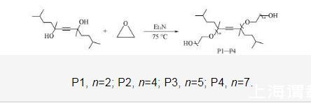 4種表面活性劑的合成條件相同,以P1的合成為例。首先將450 g(1.77 mol)2,5,8,11-四甲基~6-十二炔~5,8-二醇加入到高壓反應(yīng)釜中,用高純氮?dú)庵脫Q釜內(nèi)氣體3次;隨后加入3.65 g(0.036 mol)三乙胺,升溫至75℃后勻速通入316 g(7.18 mol)環(huán)氧乙烷,并持續(xù)反應(yīng)3.5 h;反應(yīng)完成后,將反應(yīng)釜冷卻至室溫,打開反應(yīng)釜閥門將殘余的環(huán)氧乙烷排放至尾氣吸收裝置,收集粗產(chǎn)物;通過旋轉(zhuǎn)蒸發(fā)儀除去粗產(chǎn)物中的三乙胺,得到739 g淡黃色液體,產(chǎn)率為96.5%.P2,P3和P4的合成步驟與表征見本文支持信息圖S1——S4.