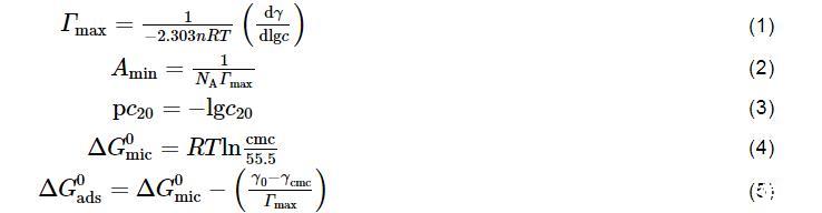 按下式計(jì)算表面活性劑在空氣/水界面處的飽和吸附量(Γmax,μmol/m2)、最小分子吸附面積(Amin,nm2)、表面活性效率(pc20)、標(biāo)準(zhǔn)膠束化自由能(ΔG0mic,kJ/mol)和標(biāo)準(zhǔn)吸附自由能(ΔG0ads,kJ/mol):