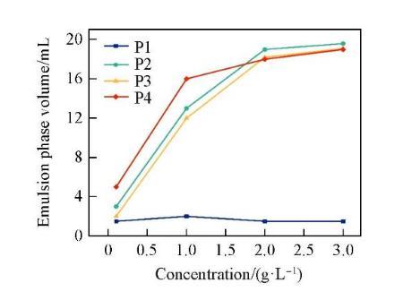 圖7示出4種表面活性劑對液體石蠟的乳化能力隨濃度的變化關系。P1由于較短的聚氧乙烯鏈段導致較差的親水性和乳化能力。隨著濃度的增加,P2,P3和P4的乳化性能逐漸提升,這是由于吸附在油/水界面上的表面活性劑分子數量隨著濃度的增加而增多,使分子形成的聚集體在界面處排列得更緊密,生成更致密、更剛性的油/水界面膜,從而使乳狀液也更加穩(wěn)定。具有長聚氧乙烯鏈的表面活性劑乳化性能更好,這是因為聚氧乙烯鏈的空間排斥作用可以防止乳液液滴聚并,有利于穩(wěn)定液滴。