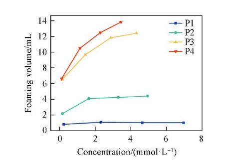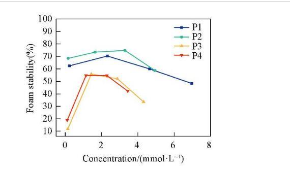 圖6示出4種表面活性劑泡沫穩(wěn)定性隨濃度的變化情況。泡沫穩(wěn)定性隨著濃度的增加先升高至最大值后又降低。這是因為表面活性劑的吸附導致了Gibbs-Marangoni效應。當液膜受到沖擊局部變薄時,產生表面張力梯度,導致鄰近區(qū)域吸附的表面活性劑攜帶水化層向薄膜處遷移,以恢復原來的表面張力并修復液膜。在較低濃度時,表面活性劑濃度的增加使得Gibbs-Marangoni效應隨之加強,進而有效阻止液膜變薄,增加泡沫的穩(wěn)定性。當濃度大于cmc后,溶液中的表面活性劑分子能夠快速吸附在界面處,使得Gibbs-Marangoni效應減弱,泡沫穩(wěn)定性降低。在4種表面活性劑中,P2的泡沫穩(wěn)定性最強,這可能是由于分子在空氣/水界面上排列最緊密,形成的液膜強度更大,因此泡沫不易發(fā)生破裂。