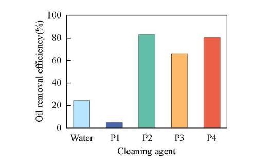 為探究表面活性劑在清洗領域的應用,測試了4種表面活性劑對油污的去除能力。在超聲清洗之前,油污的質量為41 mg.超聲清洗后,去離子水除去10 mg油污,去污效率為24.4%;P1由于溶解性差,在水溶液中大部分都不能溶解,導致去污效率很差,僅為4.9%;P2,P3和P4分別除去34,27和33 mg油污,去污效率分別達到82.9%,65.8%和80.5%,遠遠高于去離子水的去污效率(圖9)。因此,P2,P3和P4表面活性劑有著良好的去污性能,進一步說明其在清洗領域有巨大的應用潛力。