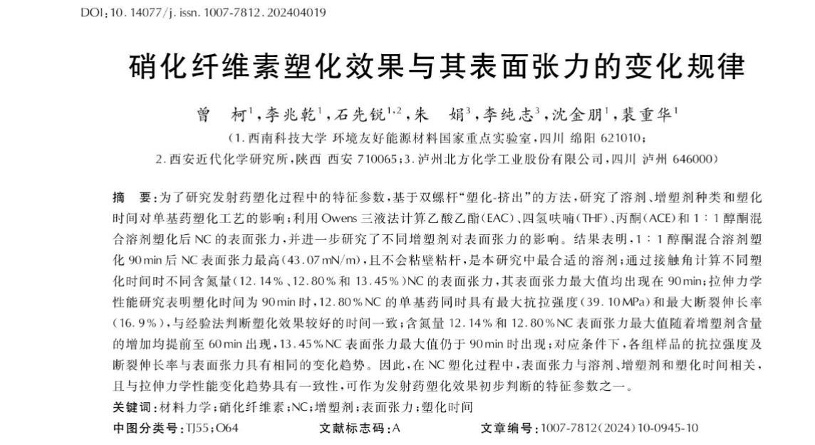 結(jié)果表明,1∶1醇酮混合溶劑塑化90 min后NC表面張力最高(43.07 mN/m),且不會(huì)粘壁粘桿,是本研究中最合適的溶劑;通過接觸角計(jì)算不同塑化時(shí)間時(shí)不同含氮量(12.14%、12.80%和13.45%)NC的表面張力,其表面張力最大值均出現(xiàn)在90 min;拉伸力學(xué)性能研究表明塑化時(shí)間為90 min時(shí),12.80%NC的單基藥同時(shí)具有最大抗拉強(qiáng)度(39.10 MPa)和最大斷裂伸長率(16.9%),與經(jīng)驗(yàn)法判斷塑化效果較好的時(shí)間一致;含氮量12.14%和12.80%NC表面張力最大值隨著增塑劑含量的增加均提前至60 min出現(xiàn),13.45%NC表面張力最大值仍于90 min時(shí)出現(xiàn);對(duì)應(yīng)條件下,各組樣品的抗拉強(qiáng)度及斷裂伸長率與表面張力具有相同的變化趨勢。