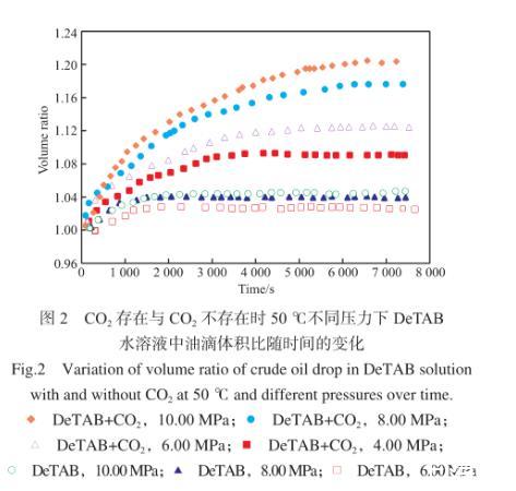 圖2為50℃下,CO2存在與CO2不存在時,DeTAB水溶液/原油體系中,油滴的體積與初始體積比隨時間的變化。由圖2可知,對于原油/CO2/DeTAB水溶液體系,在初始階段,油滴體積增加較快,在油滴體積增加到平衡值附近后,體積增加變緩慢。油滴體積達到穩(wěn)定所需時間在3 500~6 500 s范圍內。同時,隨著壓力的升高,油滴的平衡體積與初始體積比逐漸增大,這與原油體積膨脹系數隨著CO2壓力增大而增大相吻合。不含CO2的DeTAB水溶液/原油體系中,油滴體積達到平衡值所需時間在1 300 s左右,遠小于CO2存在時達到平衡狀態(tài)所需的時間;同時,油滴體積的增加幅度明顯低于CO2存在時的情況。CO2存在時,DeTAB水溶液/原油體系中,油滴體積的明顯增大,說明水中溶解的CO2可以有效地擴散進入油相中,實現其對原油的溶脹效果,這將利于將油藏孔隙中的一部分殘余油排出,從而提高油田采收率。