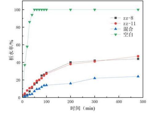 圖5是實施例1乳化性能測試中ZZ-11、ZZ-8、混合菌劑析水率曲線圖。