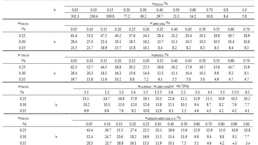 由表2可知,YM-316在質(zhì)量分?jǐn)?shù)較低時(shí)起泡能力較低,25%析液時(shí)間較長,隨著質(zhì)量分?jǐn)?shù)的升高,起泡高度呈現(xiàn)上升趨勢,25%析液時(shí)間呈縮短趨勢。鑒于YM-316質(zhì)量分?jǐn)?shù)在0.25%~0.35%內(nèi),兼具較好的發(fā)泡性能和泡沫穩(wěn)定性,本實(shí)驗(yàn)選擇質(zhì)量分?jǐn)?shù)為0.25%、0.30%和0.35%的YM-316溶液,分別與APEC-10Na和APG0810進(jìn)行復(fù)配,研究復(fù)配溶液的泡沫性能。由表2可以看出,APEC-10Na和APG0810的引入,有助于提高溶液的發(fā)泡能力。當(dāng)APEC-10Na和APG0810質(zhì)量分?jǐn)?shù)在0.2%~0.5%時(shí),與YM-316復(fù)配效果最好,其中0.3%YM-316溶液與0.3%~0.5%APEC-10Na或APG0810復(fù)配后,溶液起泡效果和析液時(shí)間均較佳。綜合起泡能力和泡沫穩(wěn)定性兩方面性能,0.3%YM-316與0.7%的APEC-10Na和APG0810(APEC-10Na∶APG0810=1∶3)混合物組成的復(fù)配溶液具有最優(yōu)泡沫性能,其起泡高度最高達(dá)298mm,同時(shí)泡沫的25%析液時(shí)間可達(dá)到397s。