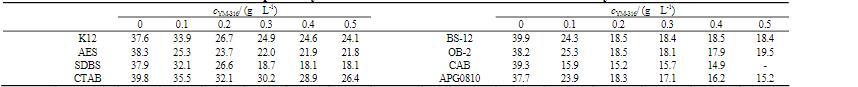 將不同濃度的YM-316分別與質(zhì)量濃度為4.0 g/L的陽離子表面活性劑,如十六烷基三甲基溴化銨(CTAB),陰離子表面活性劑,如十二烷基硫酸鈉(K12)、十二烷基聚氧乙烯醚硫酸鈉(AES)、十二烷基苯磺酸納(SDBS),兩性碳?xì)浔砻婊钚詣?,如十二烷基甜菜堿(BS-12)、椰油酰丙基甜菜堿(CAB)、十二烷基氧化胺(OB-2)及非離子APG復(fù)配后,測定復(fù)配溶液的表面張力,結(jié)果見表1。由表1可見,YM-316與陽離子或陰離子碳?xì)浔砻婊钚詣?fù)配后體系的表面張力降低不明顯,而YM-316與非離子或兩性碳?xì)浔砻婊钚詣?fù)配后體系的表面張力降低顯著,特別是與CAB或APG0810復(fù)配后其體系的表面張力可降至14.9 mN/m和15.2 mN/m。