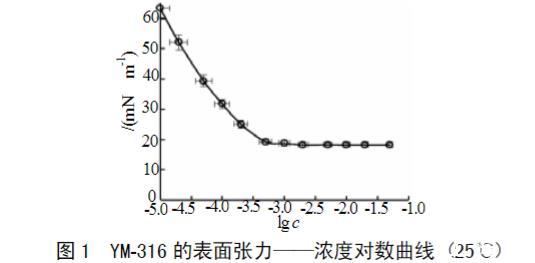 測得YM-316的表面張力隨濃度對數(shù)的變化曲線,如圖1所示。