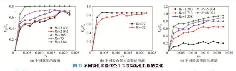 圖12(c)為液滴在不同撞擊速度下的黏性耗散情況。由圖5(b)可知,液滴的撞擊速度增加6.25倍時(shí),液滴的最大鋪展線速度增加3.14倍,液滴內(nèi)部的速度梯度增加,則根據(jù)式(22)可得液滴在撞擊過(guò)程中的黏性耗散率和黏性耗散速率均隨著撞擊速度的增大而增大。