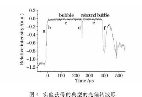 圖3給出了探測(cè)光經(jīng)過(guò)脈動(dòng)空泡的示意圖,圖中空泡脈動(dòng)特性曲線是基于空泡半徑隨時(shí)間變化的數(shù)值模擬得到的。圖4即為由探測(cè)裝置圖2(a)獲得的對(duì)應(yīng)的典型光偏轉(zhuǎn)信號(hào)波形圖,它包含了激光作用于水中靶材時(shí)的三種物理現(xiàn)象和過(guò)程,即激光等離子體沖擊波、等離子體空泡及其反彈現(xiàn)象、空泡潰滅沖擊波。圖中峰a為激光等離子體沖擊波;c為等離子體空泡信號(hào);e為空泡反彈信號(hào);f為空泡收縮到最小泡體積時(shí)輻射的沖擊波信號(hào);b為空泡膨脹壁;d為空泡收縮壁。