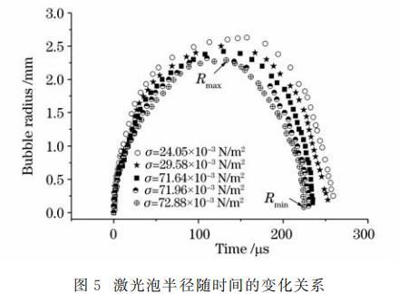 從圖5可以看出,表面張力減緩了空泡的膨脹過(guò)程。在初期,空泡膨脹變緩的現(xiàn)象不甚明顯,愈到后期越明顯。液體張力越大,空泡對(duì)應(yīng)的最大泡半徑越??;表面張力加速了空泡的收縮。表面張力越大,空泡收縮所能達(dá)到的最小泡半徑越小,且表面張力縮短了空泡脈動(dòng)周期。從圖5還可以看出表面張力對(duì)空泡潰滅的影響要強(qiáng)于對(duì)膨脹的影響。此外,激光泡半徑隨表面張力變化與液體的表面張力數(shù)值并不為線性關(guān)系,其關(guān)系有待研究。