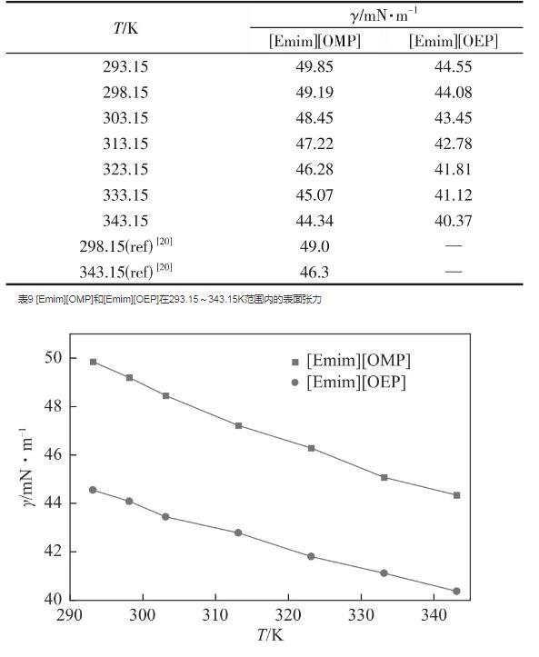 表面張力是一個對自由表面的物理和化學研究非常重要的性質,大部分離子液體的表面張力在30~60mN/m之間。[Emim][OMP]和[Emim][OEP]的表面張力實驗值如表9和圖5所示。對于亞磷酸酯離子液體,[Emim][OMP]在某論文中報道的其表面張力數(shù)據(jù)與本文最大偏差值達到了1.96mN/m。分析原因在于不同的課題組使用不同的測量方法測量表面張力,從而使測量實驗值產(chǎn)生較大的偏差。因此,對于表面張力的測定,要達到準確可靠且具有復現(xiàn)性存在一定難度。