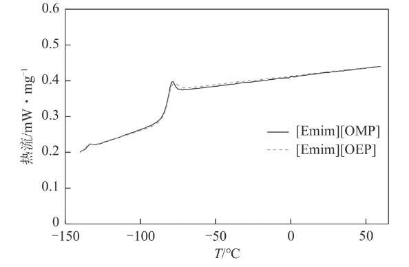 使用差示掃描量熱法對離子液體的固液相變進行了研究(圖4),結果表明[Emim][OMP]與[Emim][OEP]不存在熔點或凝固點,只有玻璃化轉變。[Emim][OMP]和[Emim][OEP]的Tg分別為-84.87℃和-85.00℃,即[Emim][OMP]與[Emim][OEP]并不存在真正意義上的固液相變,而只有冷卻或加熱過程中產(chǎn)生的無定形玻璃態(tài)與液態(tài)之間的轉變。