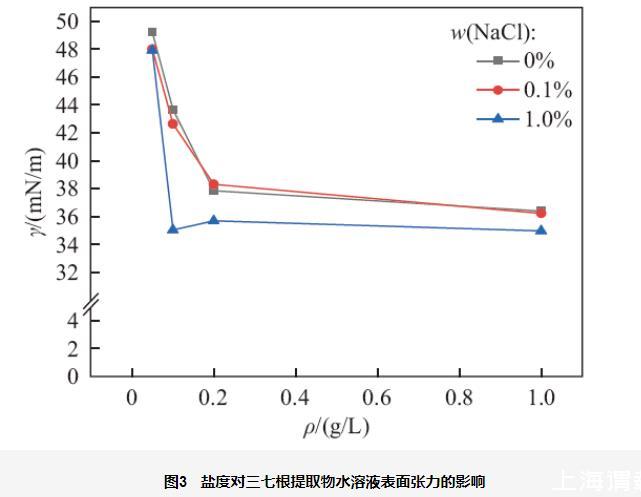 圖3鹽度對(duì)三七根提取物水溶液表面張力的影響