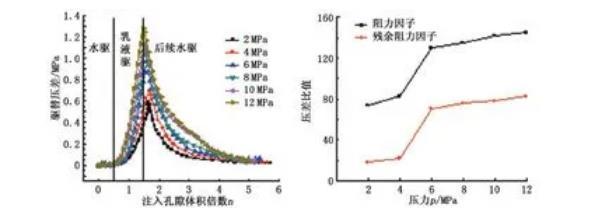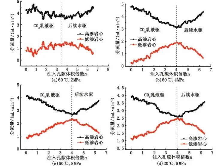 相比于高滲巖心,低滲巖心中由于毛管力較大,使得CO2乳液液滴與液膜之間的壓差大,導(dǎo)致CO2乳液易發(fā)生破裂而形成氣竄,減弱了CO2乳液的封堵性能,從而降低了流動(dòng)阻力,同時(shí)乳液更傾向于進(jìn)入高滲巖心,在巖心滲流過(guò)程中疊加的賈敏效應(yīng)會(huì)使高滲巖心的滲流阻力不斷增加,直至大于低滲巖心的滲流阻力,依據(jù)這一機(jī)制CO2乳液能夠?qū)崿F(xiàn)分流作用。