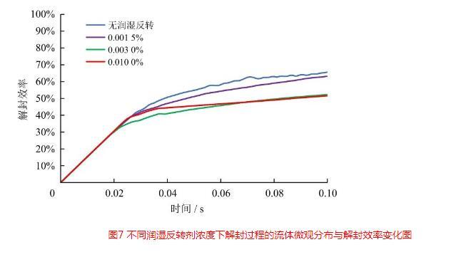 圖7不同潤濕反轉(zhuǎn)劑濃度下解封過程的流體微觀分布與解封效率變化圖