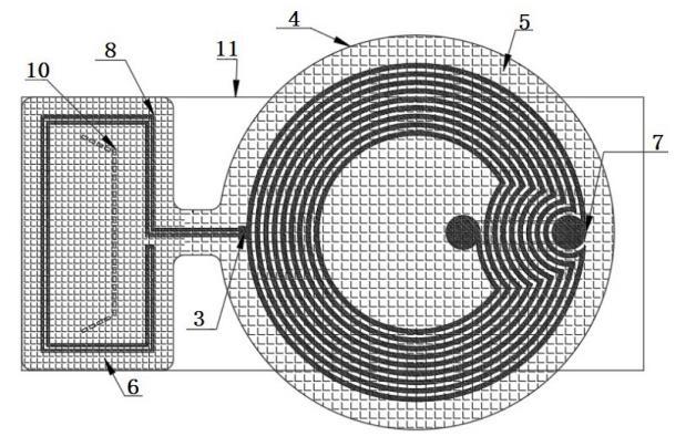 作為本發(fā)明的一種優(yōu)選技術方案:若射頻芯片為具有偵測功能的射頻芯片,則由射頻芯片的射頻端口連接布設于承載基材表面的第一走線,由第一走線在承載基材其中一端的表面上構成射頻輻射結構,并且由射頻芯片的偵測端口連接布設于承載基材表面的第二走線,由第二走線在承載基材另一端的表面上構成偵測結構;