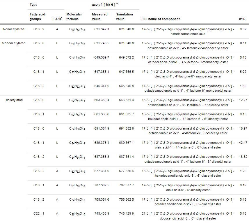 表1、表2和圖3分別顯示了乙?;疭Ls和去乙?;疭Ls的同系物組分及3種有代表性的同系物結(jié)構(gòu)圖,從表中可以看出,乙?;疭Ls的親水基主要為雙乙?;幕碧?,雙乙?;M分高達(dá)92.50%;疏水基以十八碳的疏水基為主,其中十八烯酸疏水基質(zhì)量分?jǐn)?shù)為47.95%;內(nèi)酯類型的SLs質(zhì)量分?jǐn)?shù)為97.86%。去乙酰化SLs同系物中的疏水基中十八烯酸質(zhì)量分?jǐn)?shù)最高,達(dá)到27.87%,親水基主要為去乙?;幕碧?,質(zhì)量分?jǐn)?shù)為90.56%,即使發(fā)酵菌株被敲除了乙?;P(guān)鍵基因,該產(chǎn)物中仍然有9.44%的單乙?;碧侵赡馨麅?nèi)存在其他低效率的乙?;緩?,具體原因有待進(jìn)一步研究。去乙?;疭Ls同系物中含有內(nèi)酯型、酸型和bola型SLs,質(zhì)量分?jǐn)?shù)分別為26.99%、49.98%和23.03%;而乙?;疭Ls同系物中以內(nèi)酯型為主,質(zhì)量分?jǐn)?shù)達(dá)到97.86%,酸型同系物質(zhì)量分?jǐn)?shù)為2.14%,未發(fā)現(xiàn)bola型SLs。這是由于乙酰化SLs菌株和去乙?;疭Ls菌株對(duì)底物的代謝途徑和效率不同。乙酰轉(zhuǎn)移酶基因AT的敲除使大部分SLs分子不再發(fā)生乙?;?。在去乙?;疭Ls產(chǎn)品中bola型SLs分子質(zhì)量分?jǐn)?shù)高達(dá)23.03%,與Saerens等的研究結(jié)果一致。
