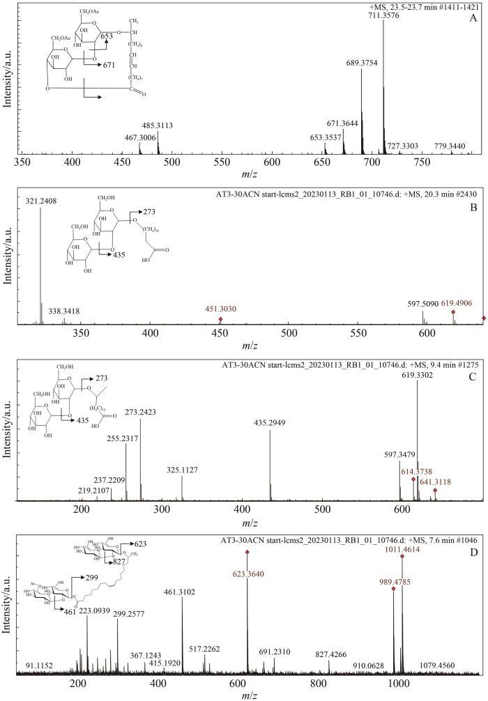 圖2(A)乙?;疭Ls保留時(shí)間為23.6 min組分的質(zhì)譜圖.(B)去乙酰化SLs保留時(shí)間為20.3 min組分的質(zhì)譜圖.(C)去乙?;疭Ls保留時(shí)間為9.4 min組分的質(zhì)譜圖.(D)去乙?;疭Ls保留時(shí)間為7.6 min組分的質(zhì)譜圖