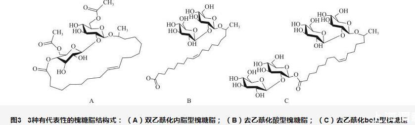圖3 3種有代表性的槐糖脂結(jié)構(gòu)式:(A)雙乙?;瘍?nèi)脂型槐糖脂;(B)去乙?;嵝突碧侵?;(C)去乙酰化bola型槐糖脂