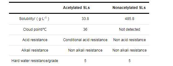 乙酰化SLs和去乙?;疭Ls的溶解性、濁點和耐酸堿性如表3所示,可以看出,去乙?;疭Ls在水中的溶解度達到485.8 g/L,較乙?;疭Ls提高了14倍以上。這是由于去乙?;疭Ls中含有豐富的親水羥基,能夠與水分子形成穩(wěn)定的氫鍵。乙酰化SLs濁點為36℃,可能限制其在高溫環(huán)境中的應(yīng)用;去乙?;疭Ls則無明顯濁點,這是由于其組分中自由酸性和bola型SLs占絕對優(yōu)勢,這2類糖脂組分的分子轉(zhuǎn)動自由度高,使其不易結(jié)晶。另外,乙?;碧侵瑸橛袟l件的耐酸級,但是為非耐堿級;去乙?;疭Ls則為非耐酸堿級,這可能是由于SLs的分子含有的β-糖苷鍵或羧酸基團容易在酸堿條件下發(fā)生水解。2類SLs均具有良好的抗硬水性能,達到最高級5級。