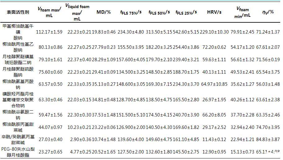 表4不同表面活性劑的泡沫體積、體積保留率、含液量等指標(biāo)結(jié)果