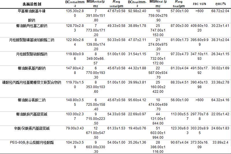 本研究除了測(cè)試表面活性劑溶液的表面張力、泡沫形態(tài)、泡沫密度保留率(ηBC)和泡沫體積保留率(ηV)外,還測(cè)試了最大泡沫含液量(Vliquid foam max)、析液半衰期(tFLS 50%)、氣泡個(gè)數(shù)半衰期(tBC1/2)、泡沫液體體積比率(MD)等指標(biāo),結(jié)果如表4和表5所示。