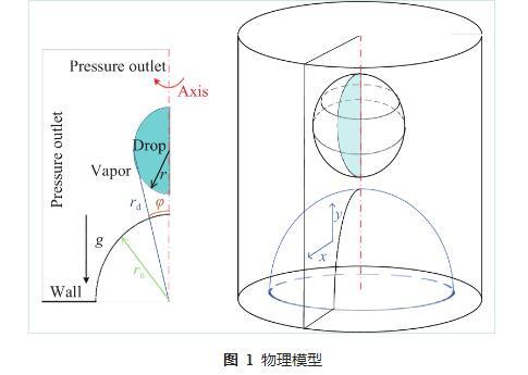 雖然,很多學者對Leidenfrost現(xiàn)象進行了一定研究,但是大部分研究成果聚焦于高溫平面上的液滴動力學與傳熱特性,而非平面上Leidenfrost現(xiàn)象的研究非常有限。但是,液滴撞擊高溫曲面廣泛存在于電子工程、機械工程、動力工程、化學工程等領域。如液滴撞擊高溫球面,常見于流化催化裂化和流化焦化等工藝,這一過程影響著多種過程系統(tǒng)的性能,尤其是對于生產(chǎn)更有價值的汽車燃料具有重要意義。鑒于此,本文進一步探究液滴與高溫球面撞擊過程中液滴的Leidenfrost現(xiàn)象,采用數(shù)值模擬方法進行研究,使用Fluent軟件構建了二維軸對稱數(shù)值模型,采用VOF模型及Lee模型,分析液滴撞擊高溫球面的動力學特性與傳熱特性,探討Leidenfrost現(xiàn)象的機理及各因素的影響規(guī)律。
