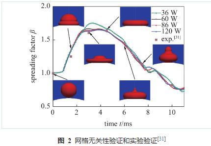 為了定量分析網(wǎng)格數(shù)量對數(shù)值模擬結果準確性的影響,以液滴撞擊壁面時的鋪展因子作為定量分析指標及網(wǎng)格無關性驗證的評判標準。網(wǎng)格數(shù)量從36 w開始增加,每次增長大約30 w,并繪制液滴鋪展因子β隨時間變化與網(wǎng)格數(shù)量的關系圖。如圖2所示,網(wǎng)格數(shù)在86 w以上時基本不會對模擬結果產(chǎn)生影響,為保證模擬精度并確保求解時間,本文采用86 w網(wǎng)格數(shù)作為模型的基準網(wǎng)格數(shù)進行模擬。從圖中也可以看出,數(shù)值模擬結果與參考文獻中的實驗結果趨于一致,說明本文采用的模型可以用于研究液滴撞擊球面的Leidenfrost現(xiàn)象。