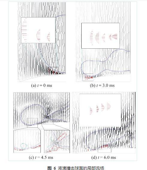 從圖中可以看出,0 ms時(shí),液滴開(kāi)始接觸壁面,液滴主要在慣性力作用下沿球表面快速鋪展,受球面形狀的影響,重力對(duì)液滴的鋪展起到一定作用,液滴通過(guò)克服黏性損失和液滴變形將動(dòng)能轉(zhuǎn)化為表面能;1.5 ms時(shí),由于蒸汽積壓,液滴底部呈扁平狀,此時(shí)氣膜較薄,底部球面上存在熱流密度明顯較大的環(huán)狀區(qū)域,同時(shí)液滴運(yùn)動(dòng)方向由軸向開(kāi)始轉(zhuǎn)變?yōu)閺较颍?.0 ms時(shí),隨著液滴繼續(xù)鋪展,流體向液滴前端積聚,徑向速度與壓力都開(kāi)始減小,同時(shí),液滴下方蒸汽流出后,周?chē)諝庋厍蛎媪飨蛞旱蔚撞?,形成回流?.5 ms時(shí),液滴達(dá)到最大鋪展,隨后,在表面張力的作用下開(kāi)始收縮,外部環(huán)狀區(qū)域壓力與速度都較小,中心點(diǎn)處氣膜較薄,具有較高的熱流密度,同時(shí),因?yàn)橐旱涡纬闪酥虚g低四周高的結(jié)構(gòu),周?chē)鷼饬餍纬啥鄠€(gè)渦流;6.0 ms時(shí),液滴逐漸收縮,外側(cè)速度與壓力明顯小于中心內(nèi)部,且液滴運(yùn)動(dòng)方向由原來(lái)的周向變?yōu)檩S向,中心區(qū)域與外側(cè)氣膜厚度都較薄,且中心區(qū)域更薄,因此熱流密度更大,多個(gè)渦流都在遠(yuǎn)離液滴;7.5 ms時(shí),液滴進(jìn)一步收縮,外側(cè)速度與壓力都在升高,軸向方向速度減弱,由于液滴底部氣膜厚度不均勻,導(dǎo)致球面熱流密度分布呈多環(huán)形,不同區(qū)域差異較大,同時(shí),因?yàn)橐旱蔚撞繅毫^高,對(duì)底部氣膜擠壓作用較強(qiáng),使氣流逸散速度進(jìn)一步提高;9.0 ms-13.0 ms階段,液滴逐漸脫離壁面,壁面熱流密度隨之減小,直到液滴完全脫離壁面,周?chē)鷼饬髟谝旱蔚膸?dòng)下逐漸沿軸向遠(yuǎn)離球面,壁面附近氣流速度逐漸減小。