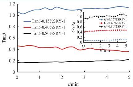黏彈性是指流體對施加外力的響應(yīng),表現(xiàn)為黏性和彈性雙重特性,通常用G′表征彈性模量,G″表征黏性模量,而G″與G′的比值記作Tanδ,用于表征流體黏彈性的強(qiáng)弱:隨Tanδ由大到小變化,流體黏彈特性越明顯,Tanδ>1時(shí),流體流動性強(qiáng),Tanδ<1時(shí),流體結(jié)構(gòu)性強(qiáng)。對0.15%、0.4%、0.8%SRY-1的壓裂液進(jìn)行了黏彈性測試(利用RS6000流變儀錐板測試系統(tǒng)進(jìn)行定頻率定應(yīng)力掃描實(shí)驗(yàn),測試得到的彈性模量G′、Tanδ變化情況見圖6所示。