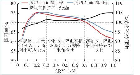 壓裂液降阻率的變化階段分別對應(yīng)了壓裂液的低黏、中黏和高黏,充分了解這一變化規(guī)律,可以合理進(jìn)行變黏控制以滿足壓裂施工不同階段(造縫階段、成網(wǎng)階段、支撐階段)對壓裂液降阻性能的特殊要求;同時(shí),測試過程中還發(fā)現(xiàn),低黏液(0.2%以內(nèi))的降阻率保持率在96%以上,而中黏液、高黏液經(jīng)過5 min循環(huán)剪切后降阻率保持率超過100%,與本體系的結(jié)構(gòu)流體特性(剪切稀釋性、觸變性)密切相關(guān),這一特性也消除了深井大排量壓裂面臨的壓裂液降阻性能降低或失效的風(fēng)險(xiǎn)。