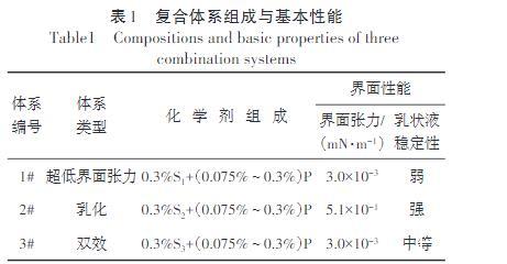 界面張力按照設(shè)定濃度分別配制超低界面張力、乳化和雙效復(fù)合體系(表1),在70°C下利用界面張力儀,測試其與目標稠油的界面張力。