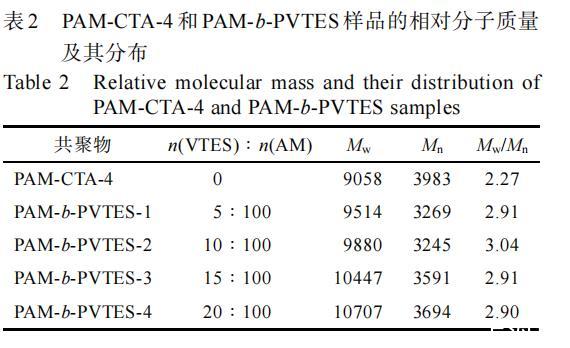 表2 PAM-CTA-4和PAM-b-PVTES樣品的相對(duì)分子質(zhì)量及其分布