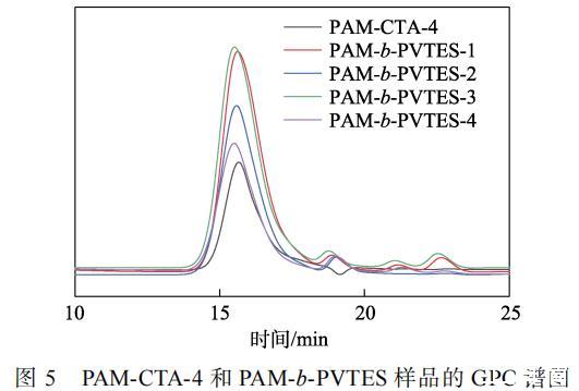 圖5為不同n(VTES)∶n(AM)合成的PAM-b?PVTES樣品的GPC譜圖,結(jié)果列于表2。PAM-b?PVTES樣品的相對(duì)分子質(zhì)量分布相較于PAM-CTA-4的相對(duì)分子質(zhì)量分布變大,且隨著VTES用量的增加,聚合物鏈段增長(zhǎng),PAM-b-PVTES的Mw從9058增加到10707。