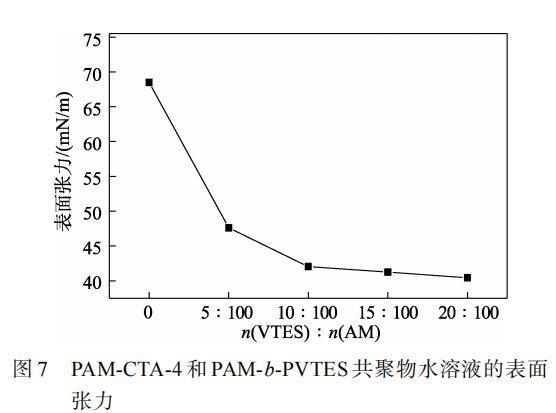 從圖7可以看出,隨著VTES用量的增大,共聚物水溶液的表面張力逐漸降低,n(VTES)∶n(AM)由0增加到10∶100時(shí),共聚物水溶液表面張力從68.49 mN/m降低到40.44 mN/m,繼續(xù)增大VTES用量,共聚物水溶液表面張力逐漸趨于穩(wěn)定。這說明VTES和AM共聚后賦予了共聚物水溶液更低的表面能,降低了共聚物水溶液的表面張力。